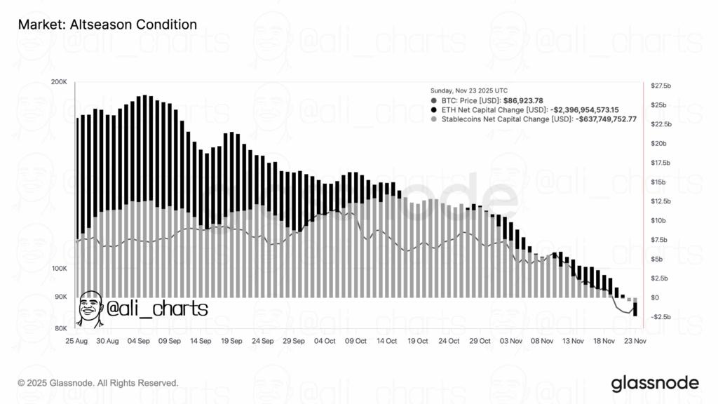 但净资本变动(显示资金流入或流出网络的金额)仍然为负值。这意味着一些持有者仍在提取资金,而不是投入更多资金。