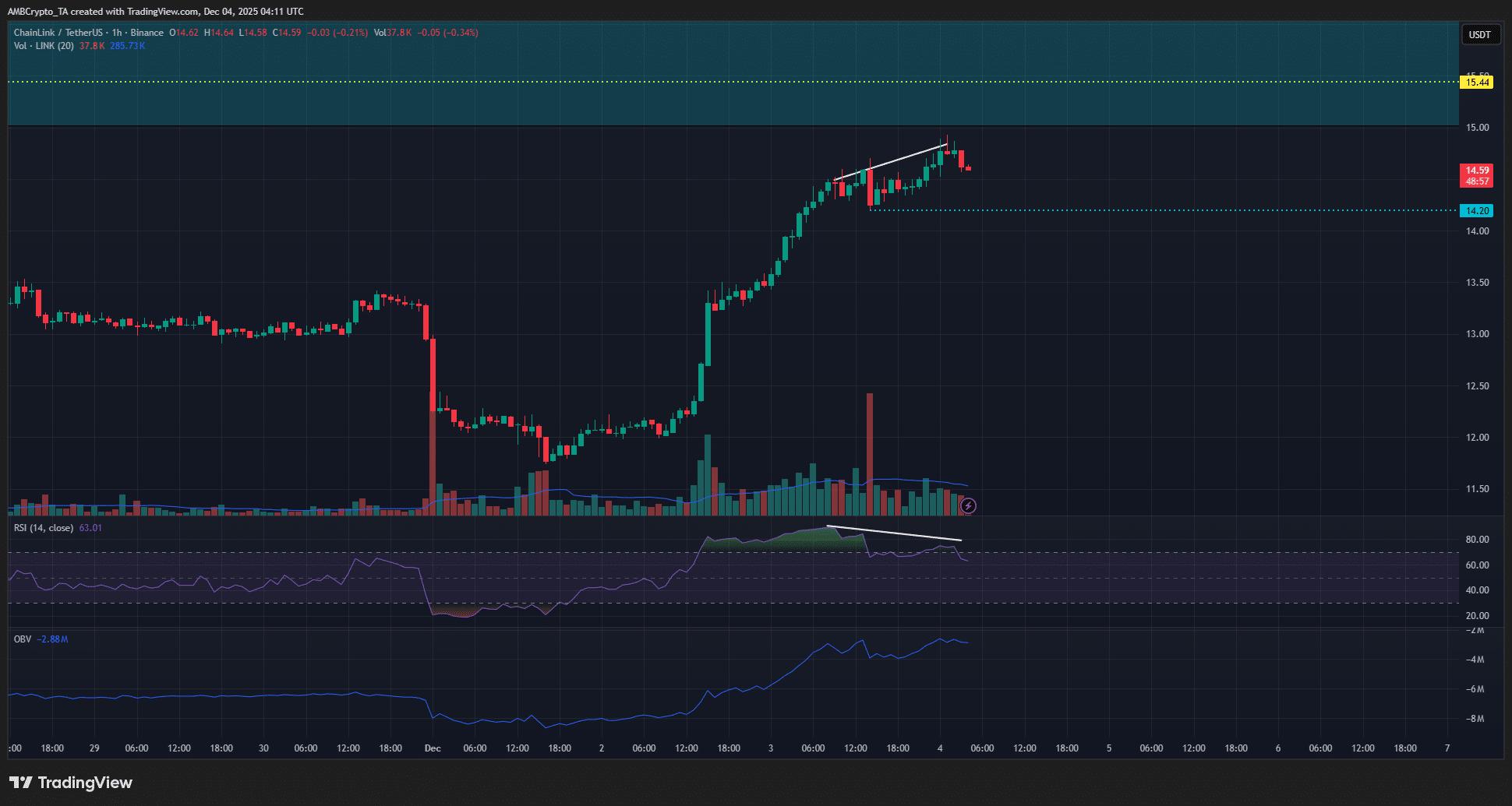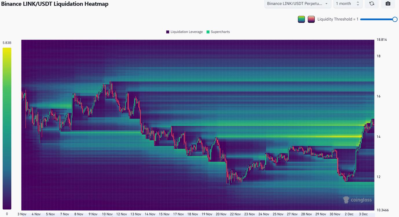清算热力图显示,LINK 的价格扫过了 13.6 美元至 15 美元的关键磁化区域。虽然上方还有更多空头清算,但它们并不像磁化区域那样密集。