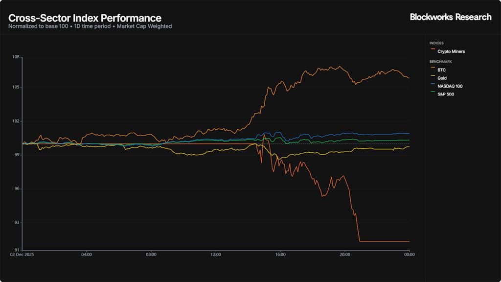市场风险偏好情绪明显高涨,加密货币整体表现优于传统资产。比特币(+5.8%)涨幅居中,而股票市场则表现平淡。标普500指数(+0.3%)和纳斯达克100指数(+0.9%)几乎没有变化。黄金价格下跌(-0.3%),加密货币矿工跌幅最大(-8.7%),表明获利回吐以及对比特币盘整的敏感度较高。