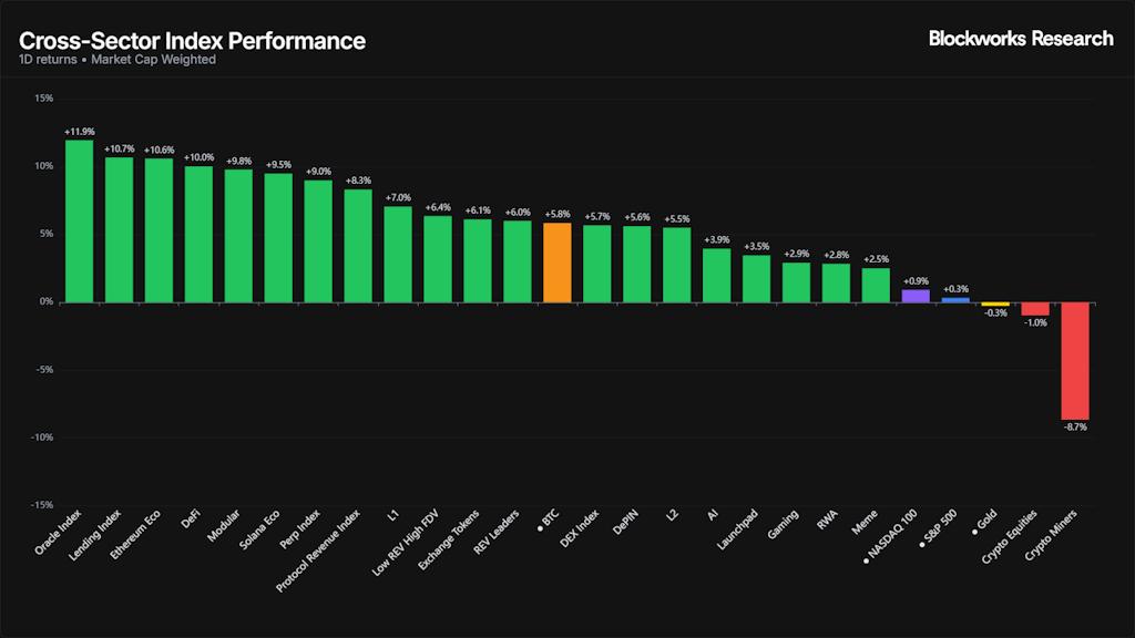 加密货币板块整体表现异常强劲。预言机、借贷以及更广泛的以太坊生态系统领涨,表明资金明显回流至核心基础设施和高利用率协议。DeFi、模块化、Solana 生态系统和加密货币紧随其后,表现同样稳健,表明市场对流动性强的替代币种领域普遍存在需求。在流动性较弱的板块中,L2 代币、人工智能应用、启动平台和游戏代币均有所上涨,而像模因币这样更具投机性的领域则表现落后。唯一明显疲软的板块是加密货币股票,尤其是矿工,它们出现了显著回调。