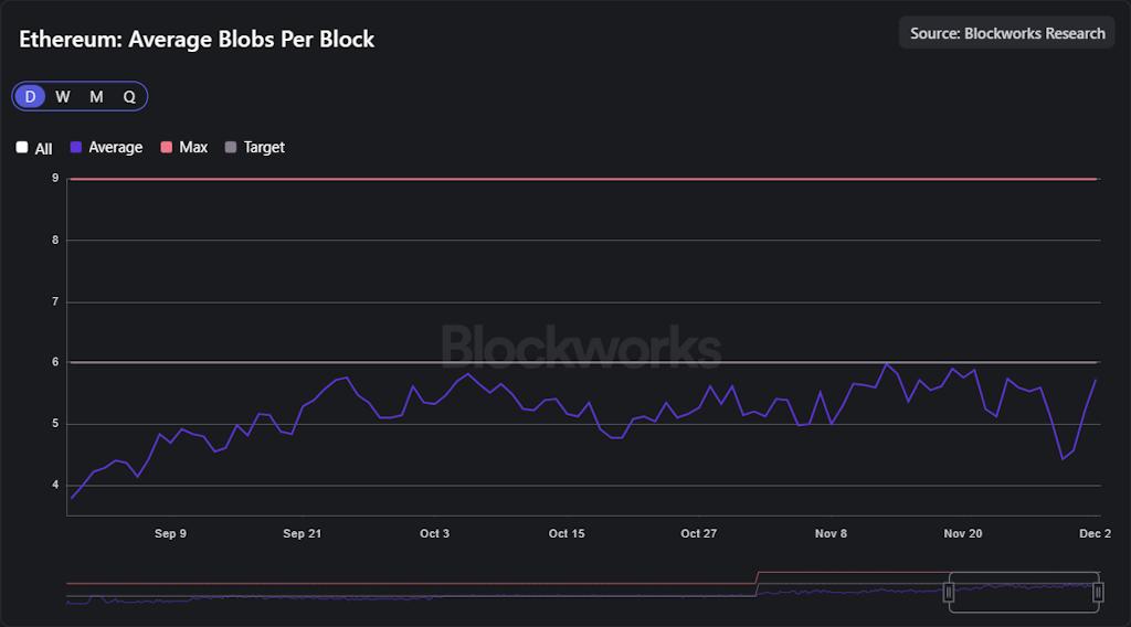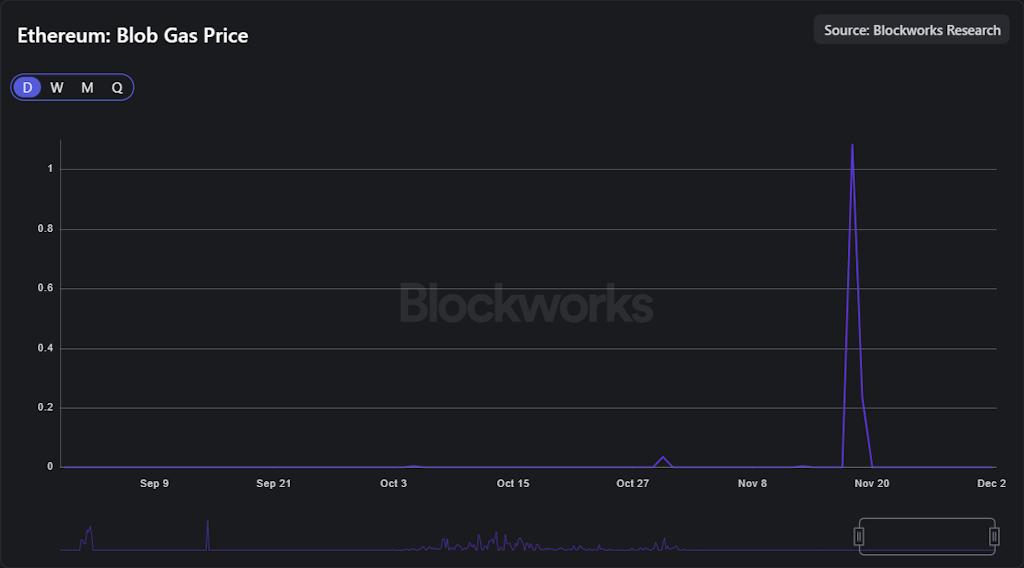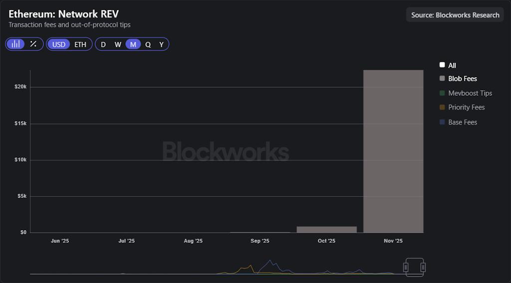 Pectra 事件之后,从 6 月到 10 月,以太坊的 blob 交易手续费约为 900 美元。11 月的短暂飙升使这一数字达到了约 23,000 美元。虽然仍然微不足道,但这凸显了 blob 交易真正形成市场时,交易额与市场规模之间的巨大差异。