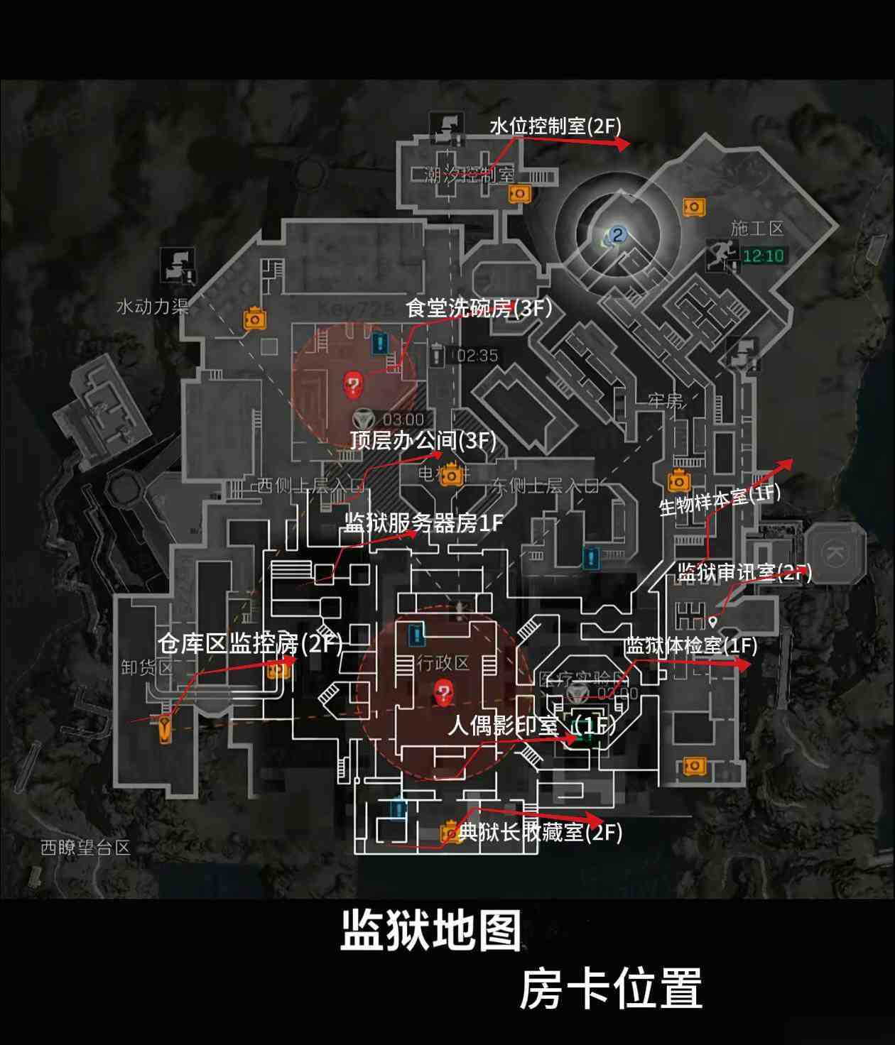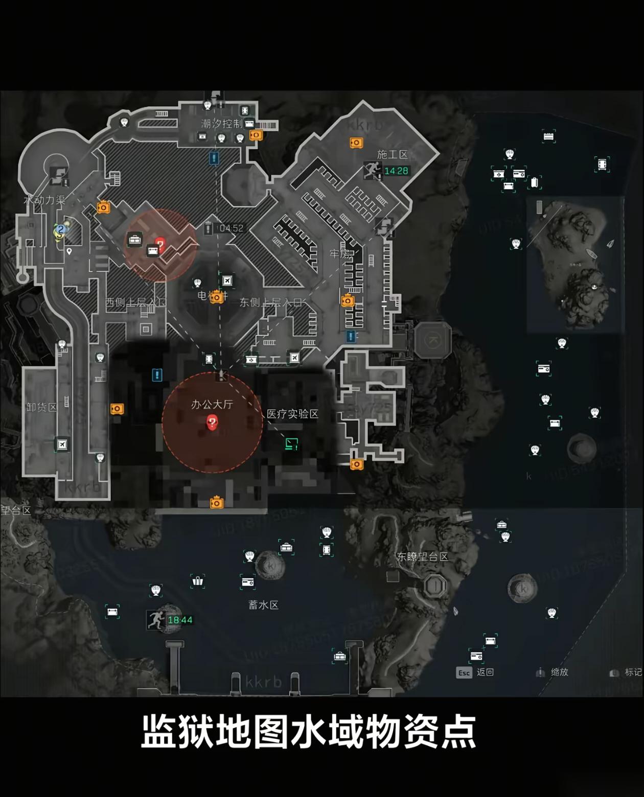 核心区(办公区/医疗区/典狱长室):含拉闸点和权限房(需对应等级卡开启),高价值物资如红色品质“海洋之泪”刷新于典狱长收藏室。