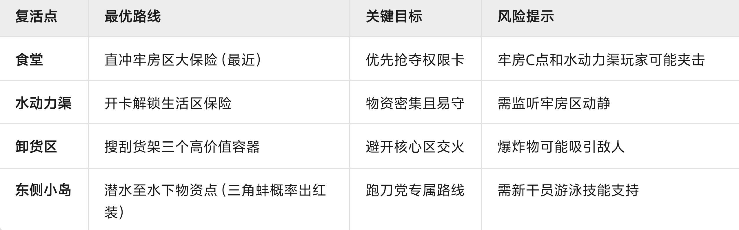 综合区(食堂/图书馆/洗浴间):双层连通结构易迷路,需注意脚步声和转角埋伏。