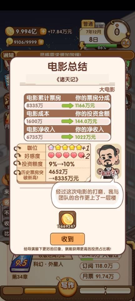 书籍刚开始创作的时候投入灵感的方式可以选择积极或者大量都行。等评分上升到十分的时候就可以改为适中投入,适中投入可以一直保持评分不变,评分只要达到8分以上就可以满足拍电影的要求,所以不用一直都是积极和大量的投入。