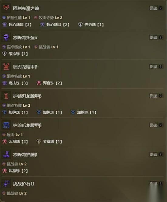 本套电锯流盾斧配装以阿剌克涅之镰为武器核心,该武器具备优秀的物理面板与元素属性加成,契合盾斧剑形态的高频斩击与斧形态的爆发输出节奏。头部选择冻峰龙头盔α,提供稳定会心率加成与冰属性抗性支持,身体部位采用锁刃龙铠甲β,进一步强化攻击性能与技能槽位布局,整体防具组合兼顾输出与生存能力。