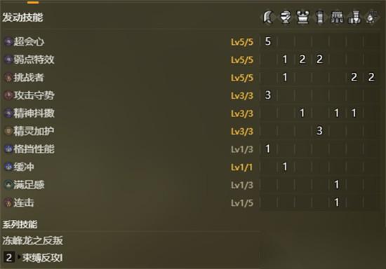 抗性与防御力方面,整套配装通过护石与部件自带属性,实现火、水、雷、冰四项元素抗性均衡分布,防御力数值处于同级别装备中的上游水平。 配合盾斧本身高耐性盾牌机制,可在面对喷吐、震地等强控技能时有效防御,减少翻滚失误带来的风险,提升狩猎容错率。