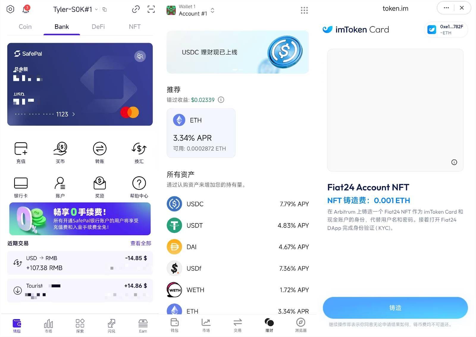 从左至右,依次为:SafePal「Bank」页面、OneKey 理财页面、imToken Card 页面