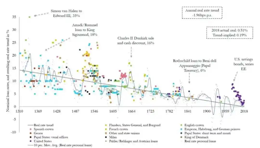 自 2012 年以来,美联储明确将 2% 年通胀率作为目标,这一目标对资产价值和美元购买力产生了广泛影响。从长期历史趋势看,利率呈现稳步下降。