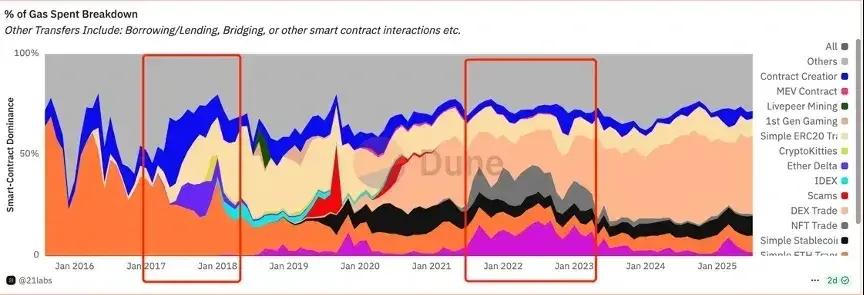 通过历史数据可以看到,借助 Gas 消耗量来分析,在 2017-2018 年,产生里大量的合约(图中左侧红框中黄色部分),并且 ERC 20 的 Transfer 也热门起来,链上资产的类型,从原生币(ETH)转化为多种多样的生态应用。