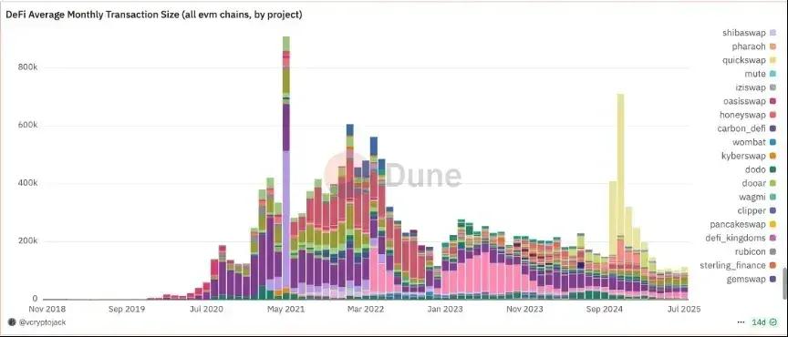 这张图,可以看到的是各类 EVM 架构链上的 Defi 类应用交易的趋势,虽然有些 EVM 并不是以太坊以及其 L 2 生态,但可以由此看到从 21 年最颠覆时期,几大群雄逐鹿到如今,已经看不清有多少的颜色(项目)在各个链上,各自开花满足着不同链上多元的金融需求。