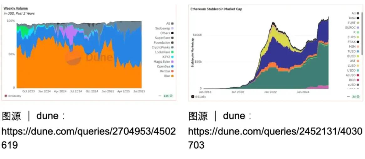 另一方面,从 CryptoPunks 到 Bored Ape Yacht Club ,NFT 不仅重新定义了数字所有权,更让以太坊在数字艺术和文化领域找到了新的价值锚点。OpenSea/Blur 的崛起证明了以太坊作为文化基础设施的巨大潜力,而这一切的基础正是以太坊完善的代币标准体系。
