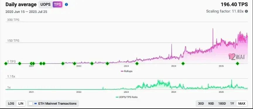前面提及,之前以太坊的 TPS 是 15/s,那现在以太坊生态整体实际的 TPS 是多少呢?