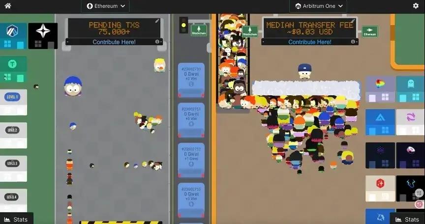 然后,让我们看到右边,他是以太坊的 Layer 2 之一 Arbitrum One,图中同样每个人与某一应用发生交互的这一笔交易,他会再柜台上留一张纸条,到一定时间后,会有一个邮差来整体收集所有的交易,形成现在的 blob,然后这个邮差走到左侧的以太坊主网上,去提交进入某个车厢里。