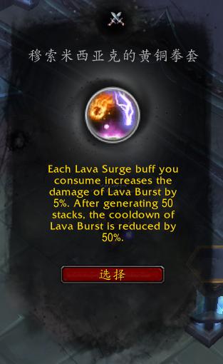 元素控制:每消耗一层熔岩奔腾(元素,恢复)/风暴使者(增强)增益效果使熔岩爆裂(元素,恢复)/风暴打击(增强)的伤害提高5%。叠加50层后熔岩爆裂(元素,恢复)/风暴使者(增强)的冷却时间缩短50%。