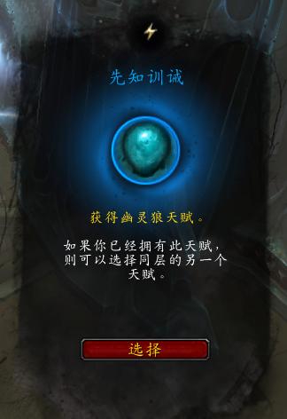 先知训诫:获得幽灵狼天赋。如果你已经拥有此天赋,则可以选择同层的另一个天赋