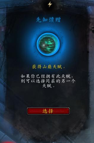 先知馈赠:获得山崩天赋。如果你已经拥有此天赋,则可以选择同层的另一个天赋