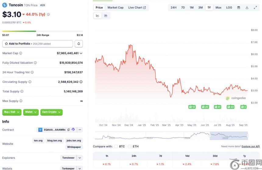 过去一年,Toncoin(TON)的价格经历了显著下跌。根据 CoinGecko 的数据,自 2024 年 9 月以来,TON 的价格已下跌超过 40%。尽管去年 6 月 TON 曾创下 8.25 美元的历史高点,并在此后累计上涨 62.5%,但目前其表现却不尽如人意。数据显示,TON 日线图下跌 0.7%,周线图下跌 1.1%,14 日线图下跌 2.4%,环比下跌 7.8%。那么,投资者是否应该对 TON 的价格下跌感到担忧呢?让我们深入探讨。