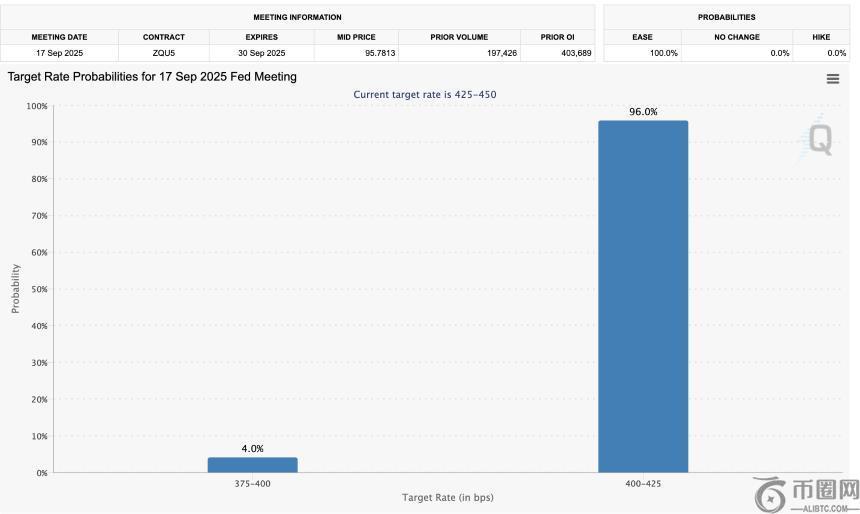 据芝加哥商品交易所集团的美联储观察工具显示,此次降息25个基点的可能性高达96%。利率下调通常会促使资本流向高风险资产类别,如加密货币和股票,这或许会在第四季度激发数字资产市场的投资热情。