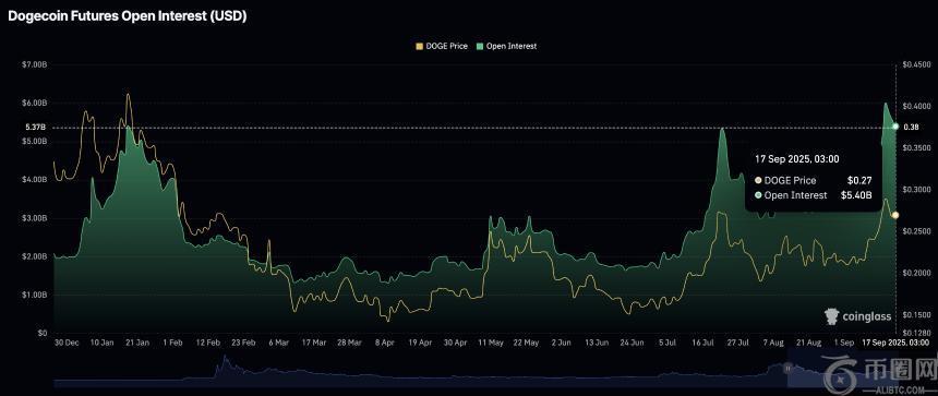 与此同时,散户对狗狗币的关注度依然较高。尽管较周日的60亿美元有所回落,但周三的期货未平仓合约(OI)平均值仍保持在54亿美元。