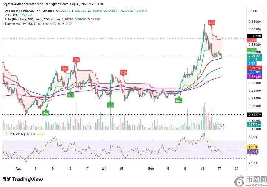 从技术角度看,狗狗币的价格波动性显著增强,4小时图上价格略高于50周期指数移动平均线(EMA),目前报0.2621美元。相对强弱指数(RSI)为47,位于看跌区域,进一步支持了短期看跌前景。