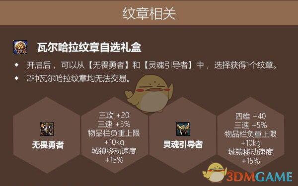 瓦尔哈拉纹章自选礼盒开启后可以获得无畏勇者和灵魂引导者,这些纹章需要购买礼包才能获取。前者给输出职业,后者给奶系职业。另外跟光环一样拥有相同的通用属性。