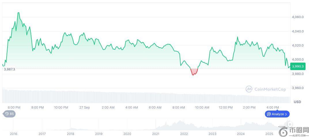 根据 CoinMarketCap 的数据,以太坊 (ETH) 目前价格为 3,996.53 美元,市值为 4,823.9 亿美元。该资产占据 12.81% 的市场主导地位。近期数据显示,ETH 交易量下降了 51%,而 ETH 的 90 天价格上涨了 61.67%。