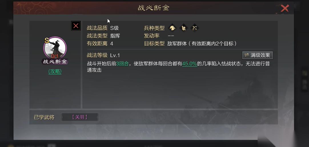 拆解战法的时注意,战必断金作为指挥战法特别稳定,90%的怯战概率几乎能废掉对面两个武将三回合的普攻。这个技能最适合给辅助带,比如庞统、郭嘉这些谋略高的武将,能有效保护队伍前期不被爆发型队伍秒掉。有些小伙伴可能会纠结要不要为了这个技能拆掉孙坚,其实如果刚好有多余的孙坚武将,拆一个完全不亏,毕竟战必断金在PVP和PVE里都是T1级别的神技。
