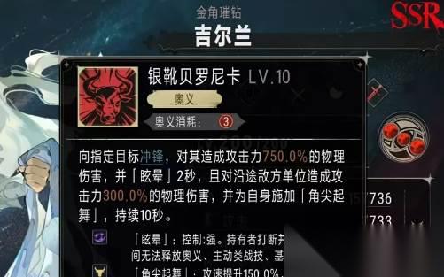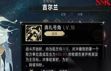 吉尔兰的战技典礼号角,在战斗开始时直接朝当前方向进行冲锋,遇到的第1个敌方单位会受到450%攻击力的物理伤害,并将其设置为攻击的主目标。冲锋结束后,自身获得角尖起舞状态,持续十秒,此状态带来150%的攻速加成,之后每秒钟损失15%,不可被驱散。虽然有着衰减效果,但是冲锋之后的瞬间带来的高额攻速,完全可以打出可观的爆发伤害。