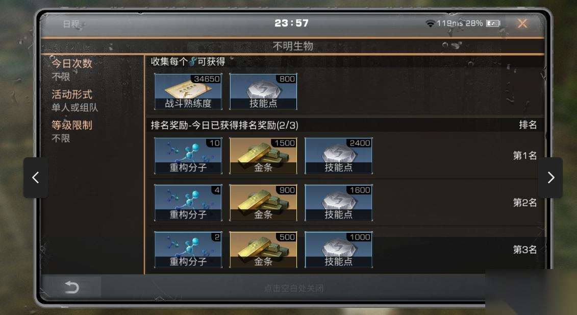 参与生存达人的活动,答题积累二百五十分钟就能直接得到两千技能点。周末参与潜入行动,能开启散落箱子、击杀伪装者拿资源包。每集齐十份物资能得到一千的点数,二十份和三十份能分别得到两千和三千。此外击杀精英怪能有六百的点数,打败不明生物还会有排名奖。第一名有一千二白点,第二名和第三名分别有八百和五百点。参加重返希望谷的活动时,也能根据通关市场薅到不菲的技能点。一星能有九千到一万二,四星则能有一万五到两万一的点数。101居民委托中开箱子的时候,也有几率从里面拿到一两千的点数。
