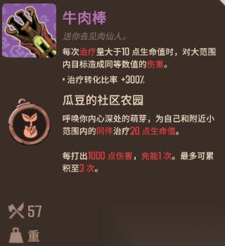 这把瓜豆系列的加农炮武器听着就挺唬人,还能给自己和队友加血,挺有意思的。不少玩家都在打听熔炉密林牛肉棒怎么样,说真的,这玩意儿挺特别的。我们在第二章干掉瓜豆BOSS就能拿到,攻击力57,重量挺沉的,但效果炸裂。每次治疗超过10点血,会在周围炸出同等伤害,还能把治疗量翻三倍,简直是肉盾神器。武器斗技也挺有意思,打伤害能充能,最多攒三次,放技能能给小范围队友加20点血。社区农园的描述更是神,"送你去见肉仙人",不知道是褒是贬。