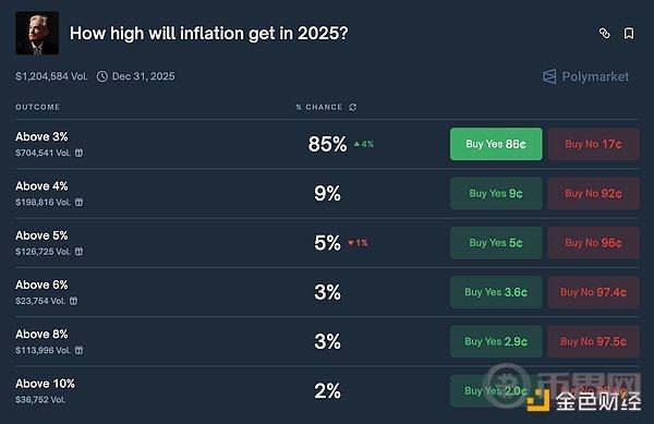 这些老练的投资者之所以谈论黄金,并非因为他们认为通胀会处于低位。事实上,预测市场Polymarket显示,通胀率超过3%的可能性高达85%。