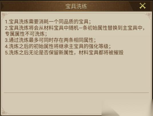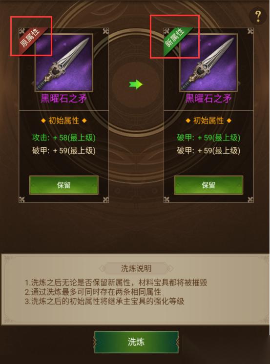 tips1:如果洗练出的属性自己不喜欢,可以选择保留原属性,大家操作的时候要注意呀~ tips2:只要宝具的属性等级提升,那么宝具的品级也会提升。比如原本带两条下级属性的紫色宝具,把两条下级属性洗练为上级后,宝具的品级也会变为上级;