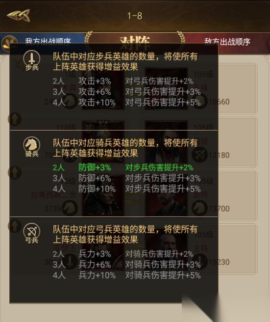 上阵同兵种英雄属性加成:与战役玩法相比,征程玩法中,上阵同兵种英雄达到指定数量可以获得特定的属性加成;