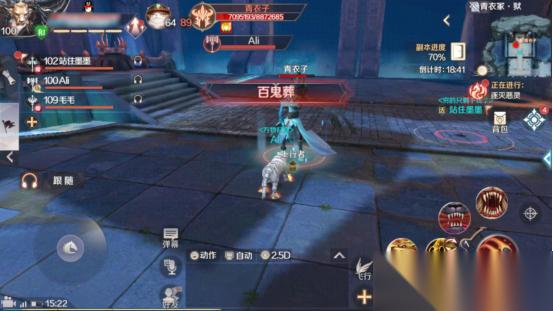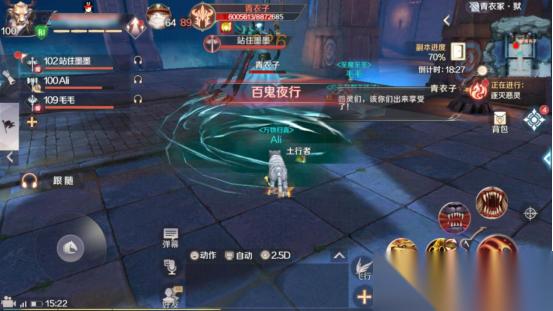 百鬼夜行则是青衣子在附近召唤一群小鬼,小鬼会对我们发起进攻。在青衣子释放此技能时,妖兽使用风火轮对青衣子发起进攻,即可吸引小鬼的仇恨。小鬼比较脆,比较容易消灭。