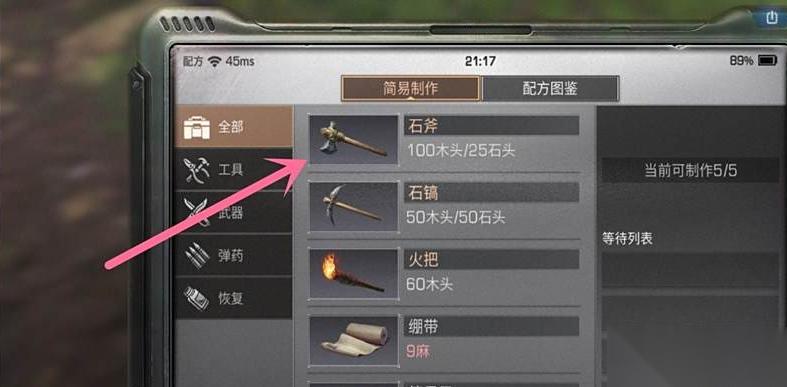 左下角配方书图标→工具分类页→找到石斧图标(带石头纹理那个)