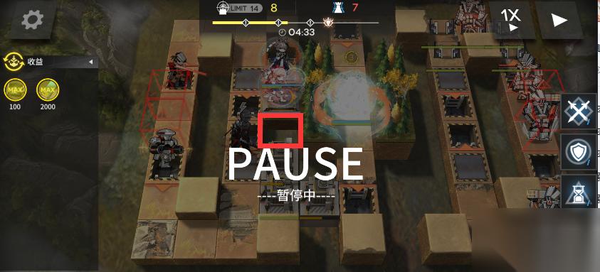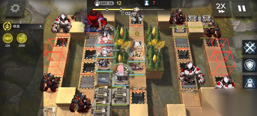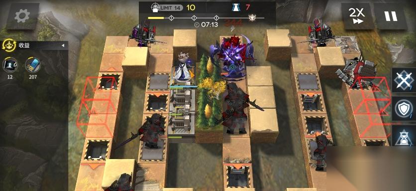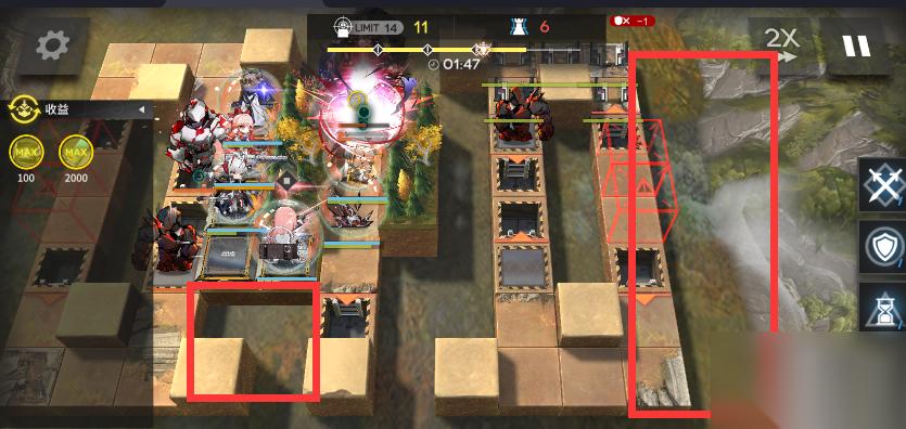 最右侧上面地上铺祭坛,暖机遥的技能,暖好之后放一个先遣侦测器下面让遥的格子变成加攻速的,再撤离先遣侦测器,放岗哨,放维什戴尔,再放个先遣侦测器把维什戴尔的高台强化