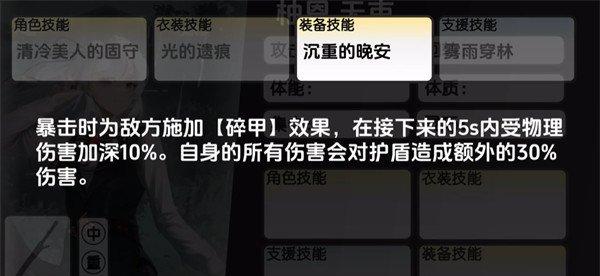 装备技能大家可以选用沉重的晚安,有了这个技能效果柚恩就可以在暴击时为敌方施加【碎甲】效果,在接下来的5秒内受物理伤害加深10%,且她自身的所有伤害会对护盾造成额外的30%伤害。柚恩最后的支援技能叫做雾雨穿林,这个支援的效果是当己方有角色护盾被击破时就可以触发技能的能力,此时柚恩会发动一次特殊攻击【破雾】带来输出,但是这个支援技能的效果是每8秒只能触发一次的,所以大家要计算好使用间隙。