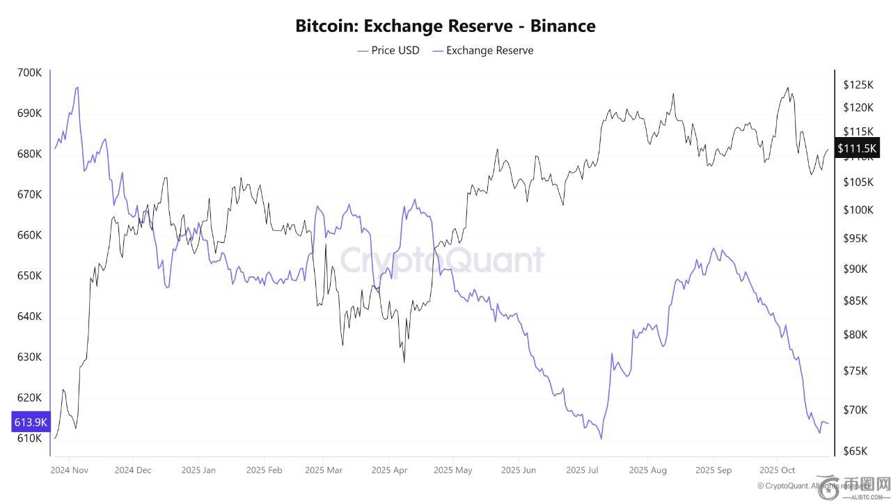 Taha 指出,币安的比特币交易储备已大幅下降,目前已接近 61 万 BTC,这是 7 月份达到的水平,也是去年的最低水平之一。尽管比特币的交易储备在 2025 年全年稳步下降,但分析师指出,最近的下降幅度看起来“极其剧烈”,暗示着即将发生根本性变革的可能性。