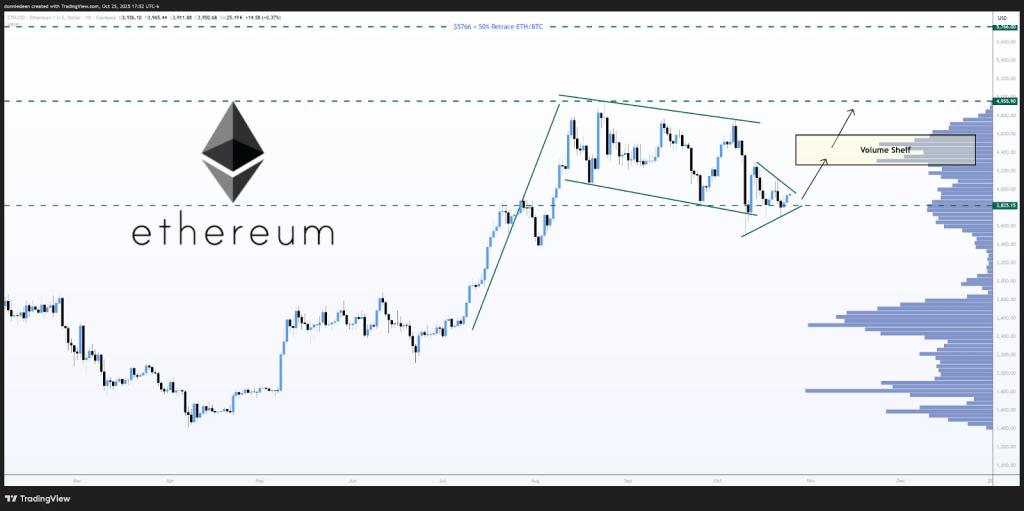 从技术角度来看以太坊的K线走势图呈现出牛市旗形形态,这通常预示着价格将出现强劲上涨。目前,ETH正在三角形形态内盘整,位于3,825美元支撑位附近,关键上行目标位于: