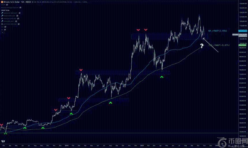 他关注的比特币关键价位大致在 111,000 美元至 114,000 美元之间,他提到这个价位是因为它重新获得了阻力位和成交量加权平均价格 (VWAP) 水平。“如果比特币不能在短期内重新回到这个价位,我认为我们需要做好迎接更大幅度下跌的准备,而下跌幅度可能会跌破 10 万美元,”他说道。他认为第一个下跌目标位在 98,500 美元附近,这与他所说的 12 个月滚动 VWAP 相吻合——“这是我们整个牛市周期的牛市区间”。