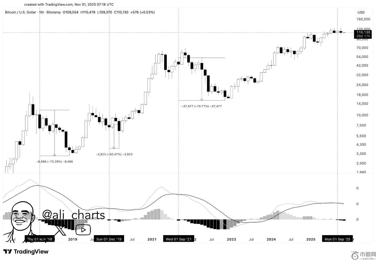 马丁内斯指出,过去曾出现过多次下跌,2018 年下跌约 73%,2019 年下跌约 50%,2021 年至 2022 年下跌约 71%。