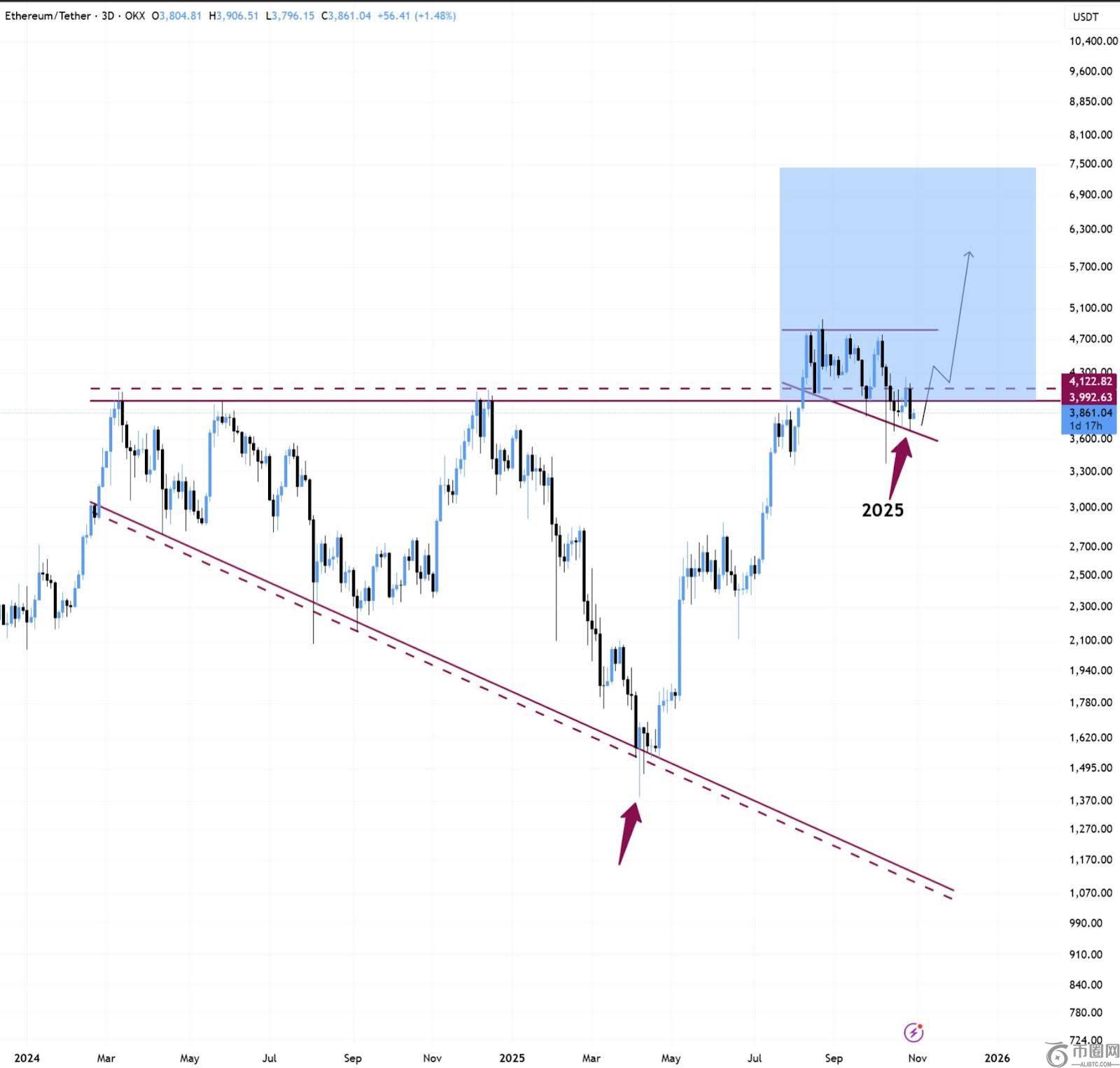图表中较宽的蓝色区域标出了如果牛市旗形形态出现,ETH 可能会扩张的区域。