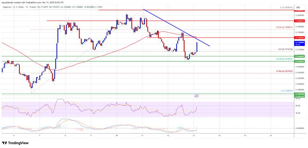 狗狗币价格目前低于 0.1780 美元和 100 小时简单移动平均线。上行阻力位在 0.1760 美元附近。此外,在 DOGE/USD 小时图上,一条阻力位在 0.1760 美元的下降趋势线正在形成。