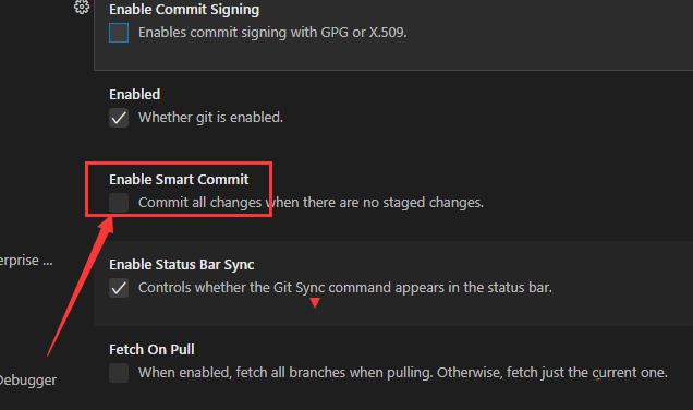 3、然后找到右侧中的"enable smart commit",将其小方框勾选上就可以了。