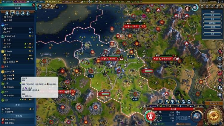 建造娱乐中心及其建筑,可为城市及其他城市提供宜居性。阿尔罕布拉宫等一些奇观也可以提供宜居性加成,政策卡的选择也可以影响宜居性。一些军事政策卡在部队驻扎时可以提高城市的宜居性,这在战争期间尤为有用。面对宜居危机,建设娱乐中心区是最直接的解决方案,尤其是当许多城市面临宜居压力时,一个区域可以同时覆盖许多城市。
