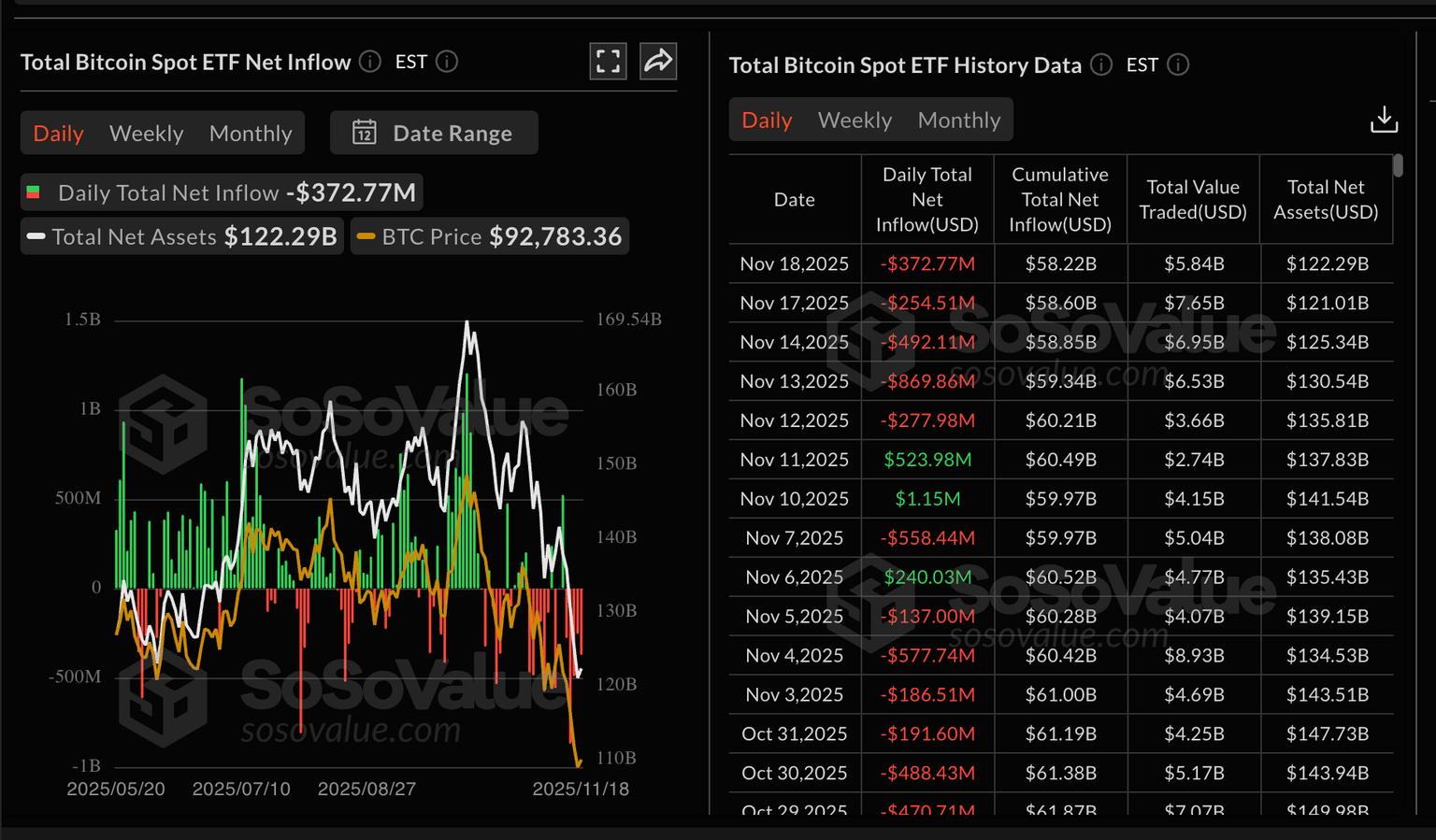 比特币现货ETF周二延续跌势,资金流出近3.73亿美元。SoSoValue数据显示,BTC ETF的净资产已从10月6日的约1700亿美元降至1222.9亿美元。累计净流入量平均为582.2亿美元。