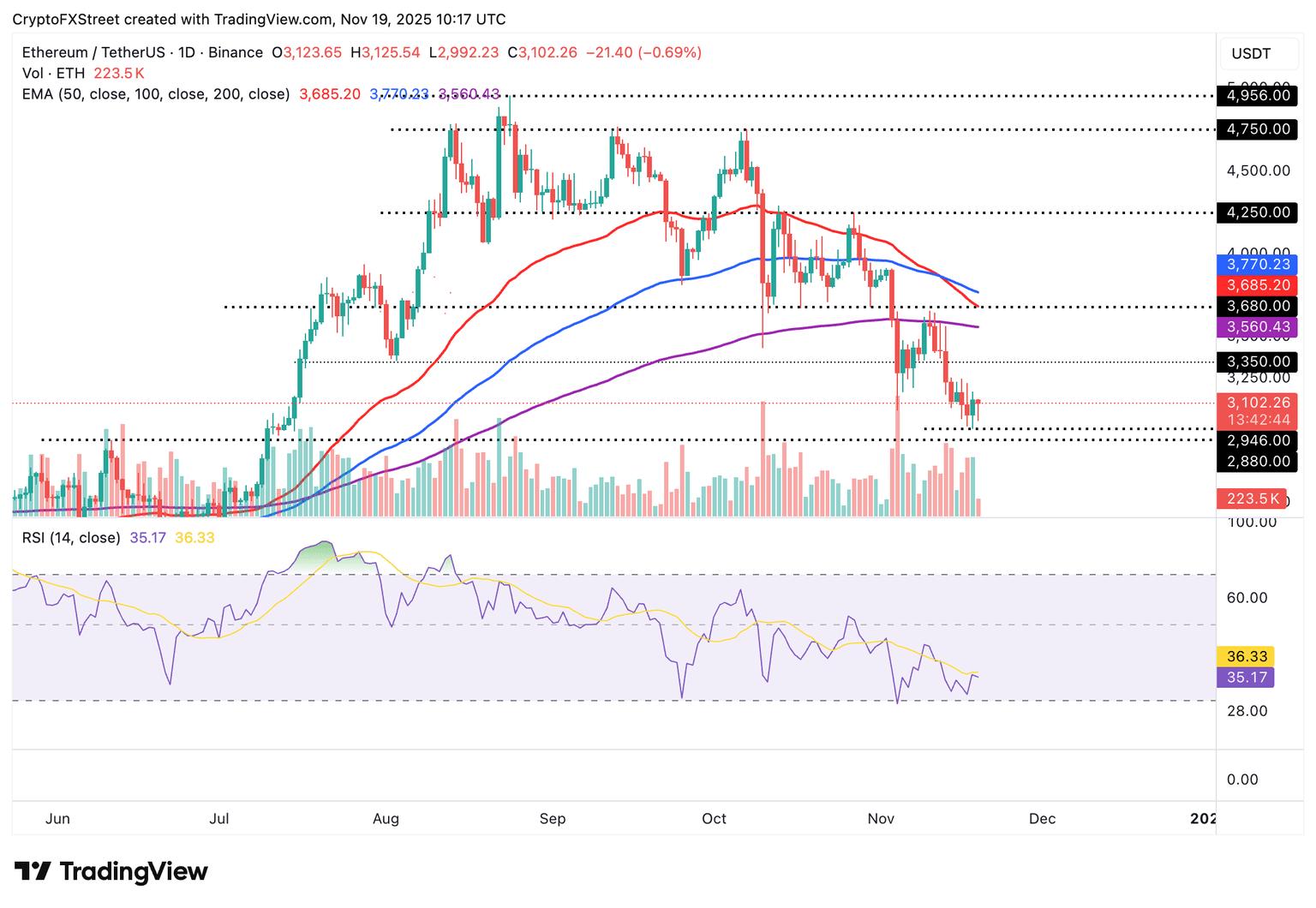 日线图上的相对强弱指数(RSI)为35,接近超卖区域,表明技术结构正在走弱。持续下跌将意味着强劲的空头动能,并可能增加跌破3000美元的可能性。