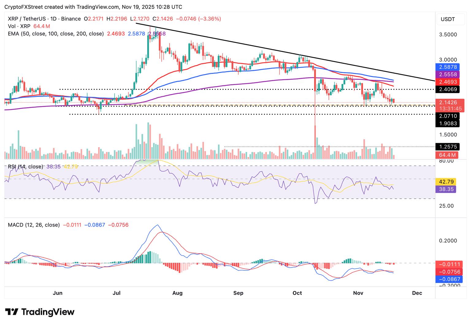 截至周三发稿时,XRP价格在2.07美元至2.10美元的支撑位上方徘徊,多头难以掌控局面。日线图上的相对强弱指数(RSI)为38,并已跌至超卖区域,这表明看跌前景已出现初步企稳迹象。