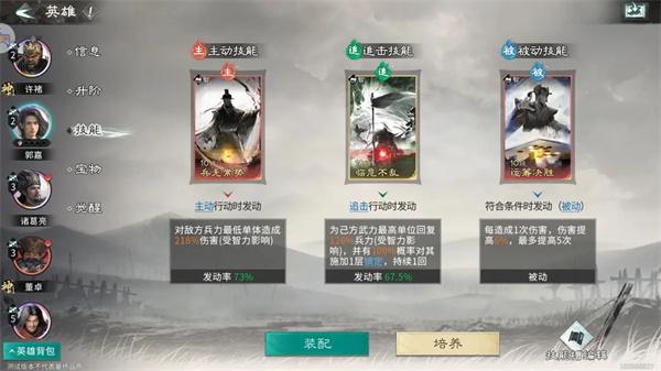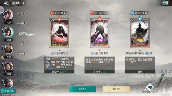 主动技能:推荐携带【通权达变】和【鼎力相助】,【通权达变】可以减少敌方攻击并且有概率施加混乱;【鼎力相助】可以为许诸提供增伤。