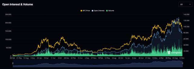 数据来自 Coinglass 网站演出加密货币市场未平仓合约量在10月初创下历史新高后显著下降。10月7日,未平仓合约量达到2330亿美元的峰值,与比特币价格突破12.6万美元的峰值同时出现。然而,此后这股势头未能持续,随着比特币价格暴跌,加密货币市场未平仓合约量也随之下降。加密货币未平仓合约遭受了损失。